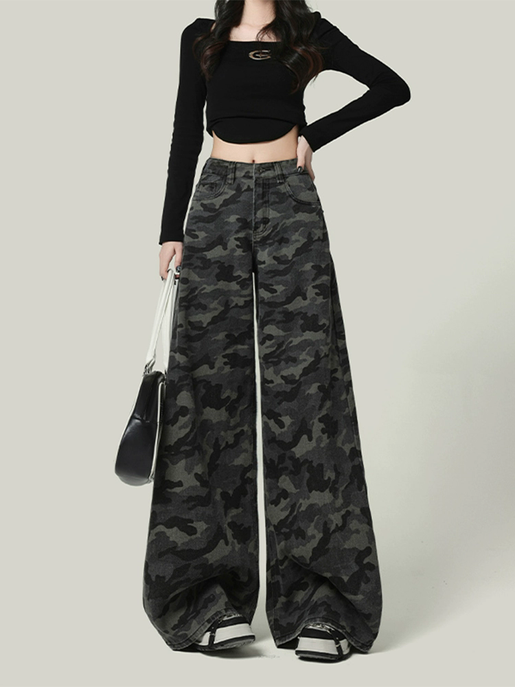 美式复古迷彩阔腿牛仔裤女夏季2025新款宽松直筒高腰工装裤子
