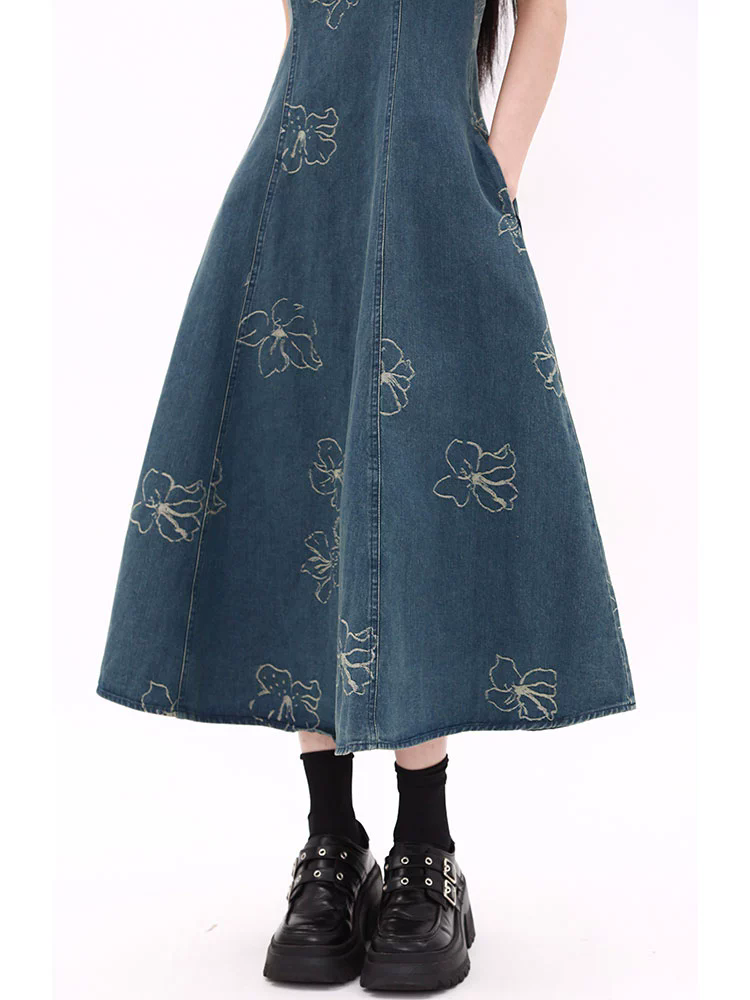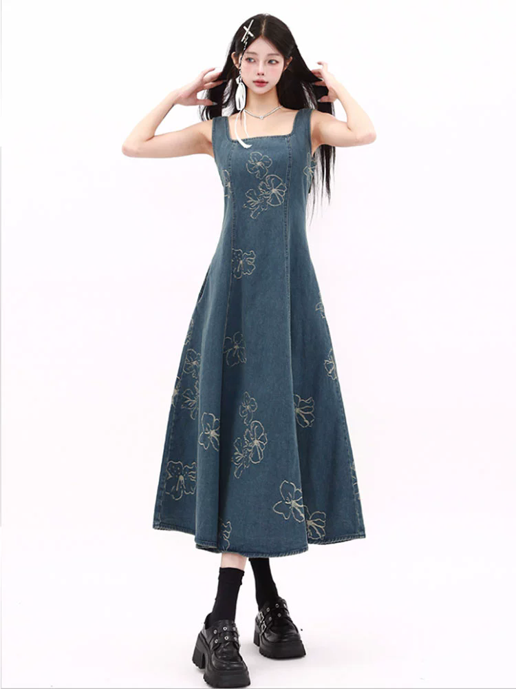 复古新中式国风刺绣背带牛仔连衣裙女夏季方领收腰吊带长裙子