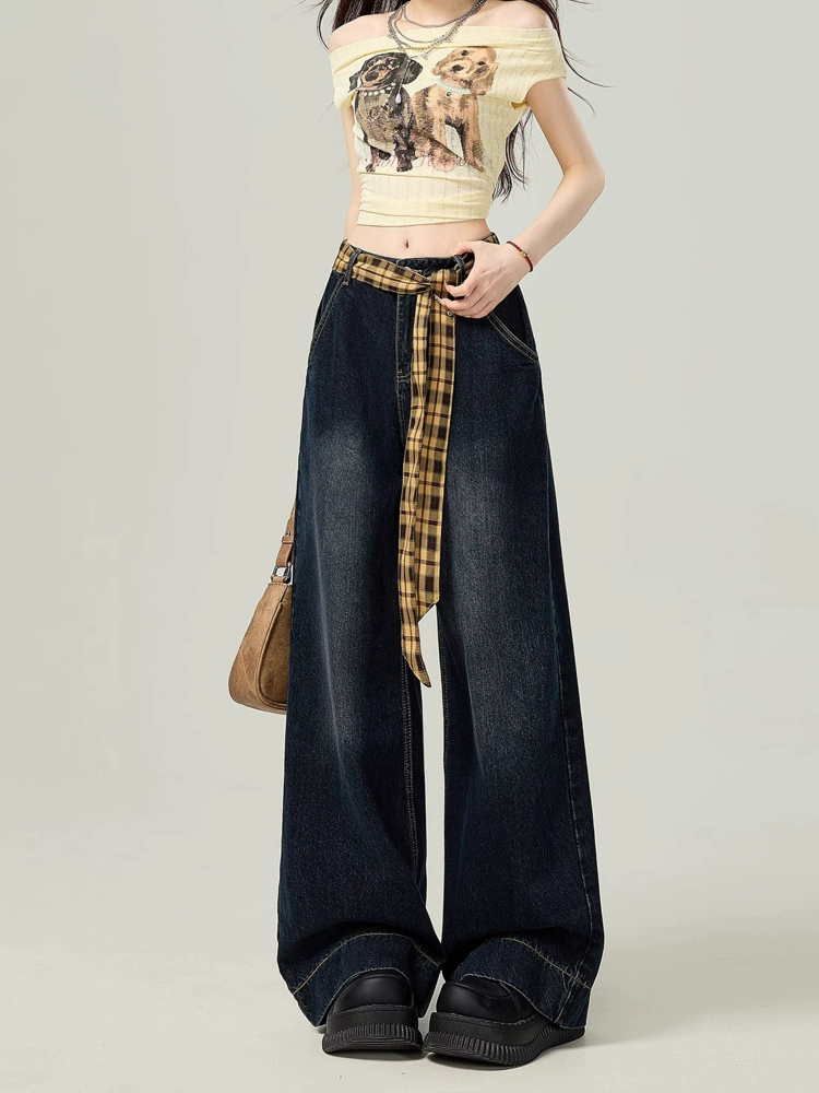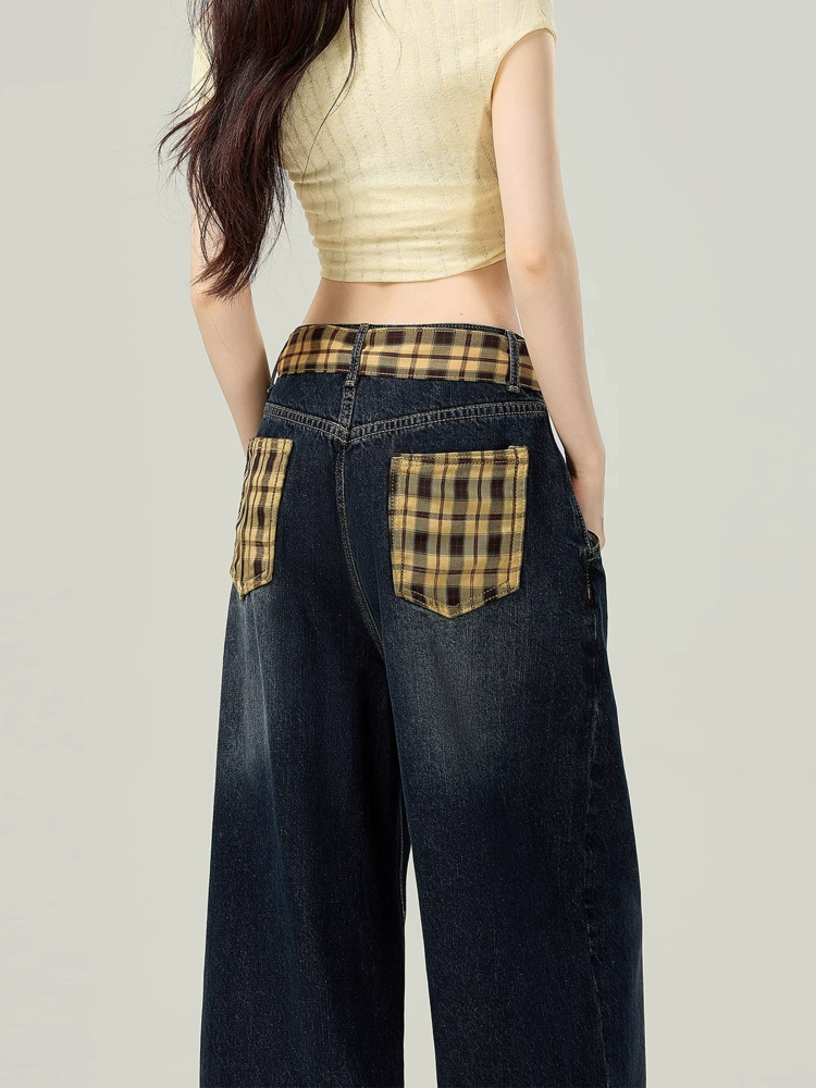 美式复古格子拼接绑带牛仔裤女夏季2025新款宽松直筒阔腿裤子