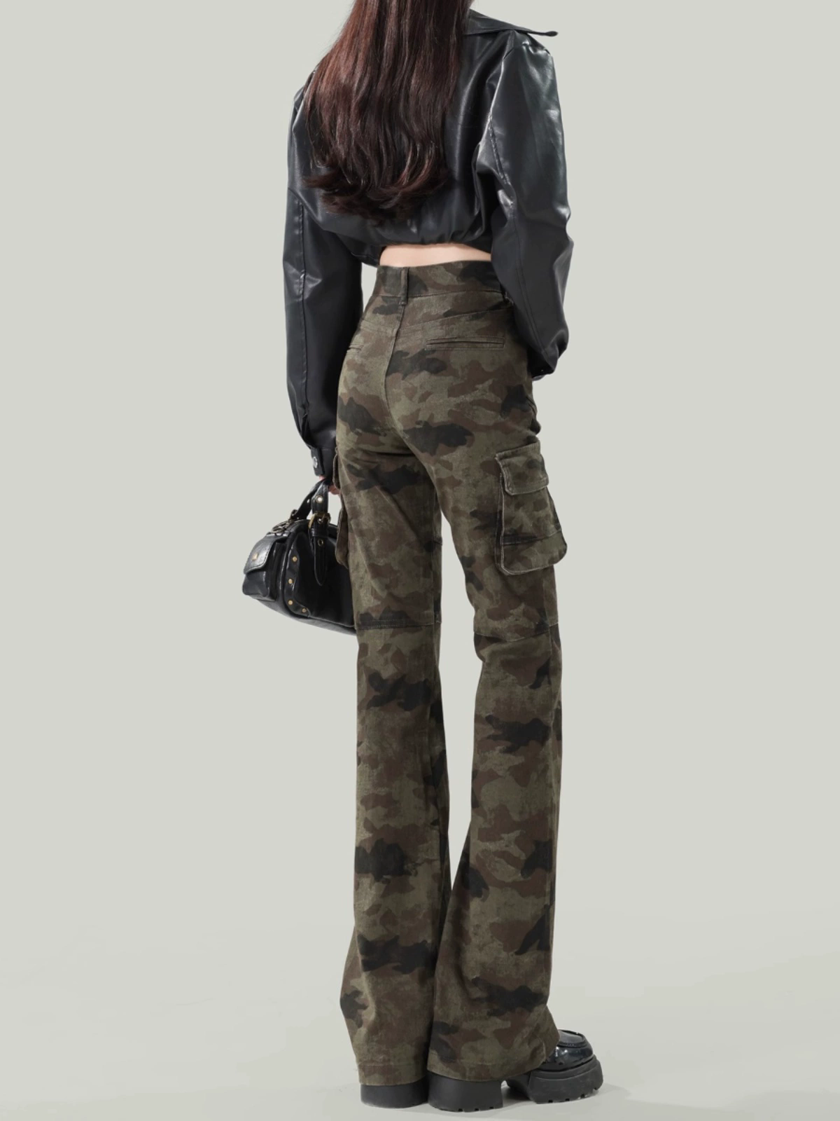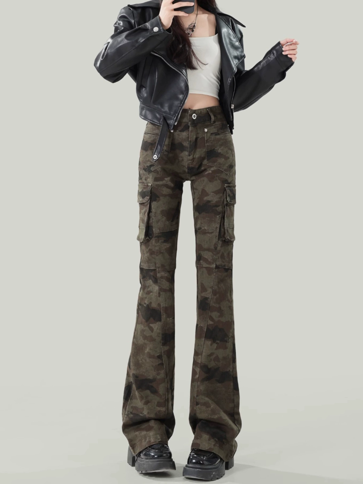 美式辣妹迷彩微喇牛仔裤女春秋季显瘦马蹄喇叭裤低腰工装裤子