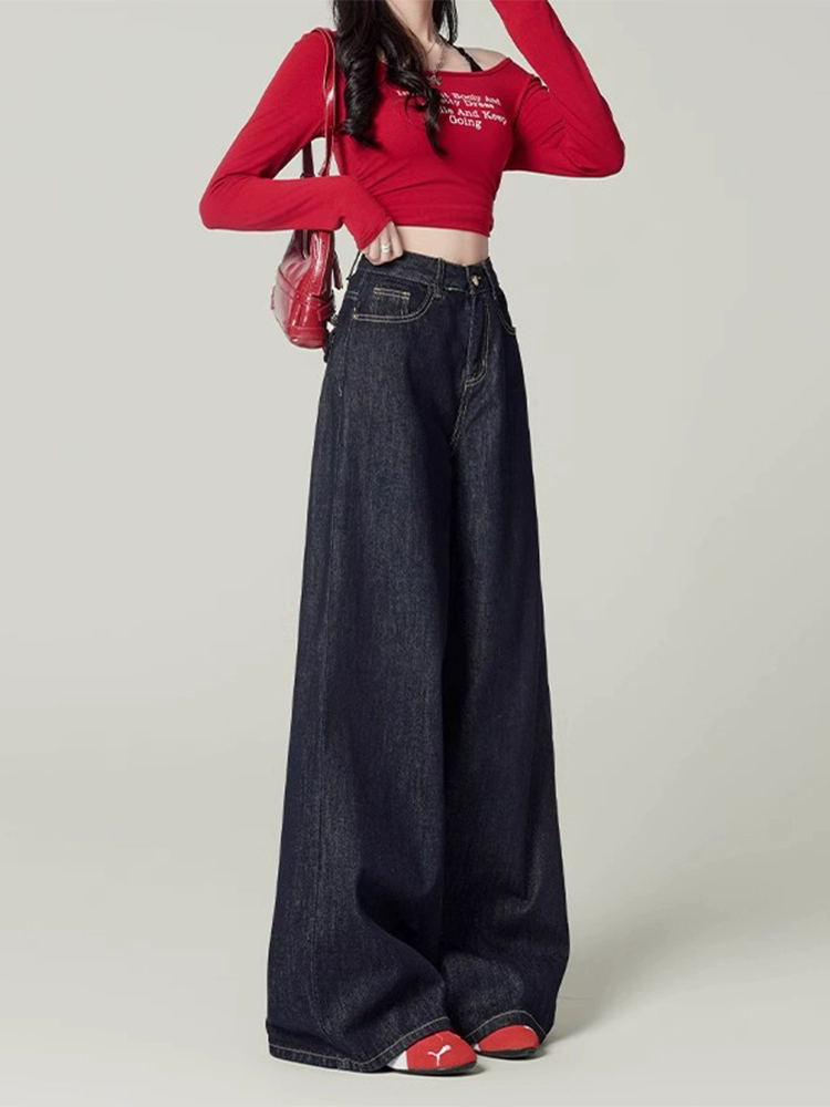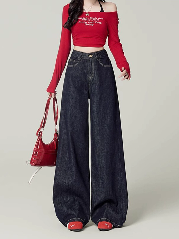 美式深蓝色高腰阔腿牛仔裤女夏季2025新款工装宽松直筒长裤子